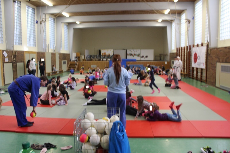 Das Training wurde speziell auf das Alter und die körperlichen Gegebenheiten der ca. 280 jungen Teilnehmer/innen abgestimmt. Im Vordergrund stand der spielerische Aspekt. Viele Kinder hatten große Freude an Spielen mit Namen wie Schildkrötenfangen, Sumo und Indianerkampf. So muss man beim Indianerkampf versuchen, stehen zu bleiben und seine Füße nicht zu bewegen, obwohl das andere Kind einen umwerfen will.